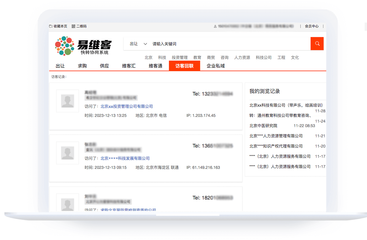 帮助用户便捷获客,让客户不流失。功能包含来访内容、访客信息、来访互动和信息反馈等。